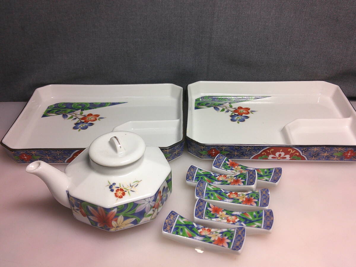 - ◆刺身皿/長方形・仕切り皿/和食器/2枚(花モミジ蝶柄)醤油/箸置×5付・サイズ幅18.5㌢奥行14㌢高さ2.5㌢・箱なし◆730