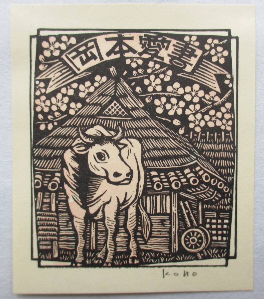 - 【真作】■蔵書票・木口木版画■作家:大内香峰●題:1985年蔵書票「牛と牛小屋」