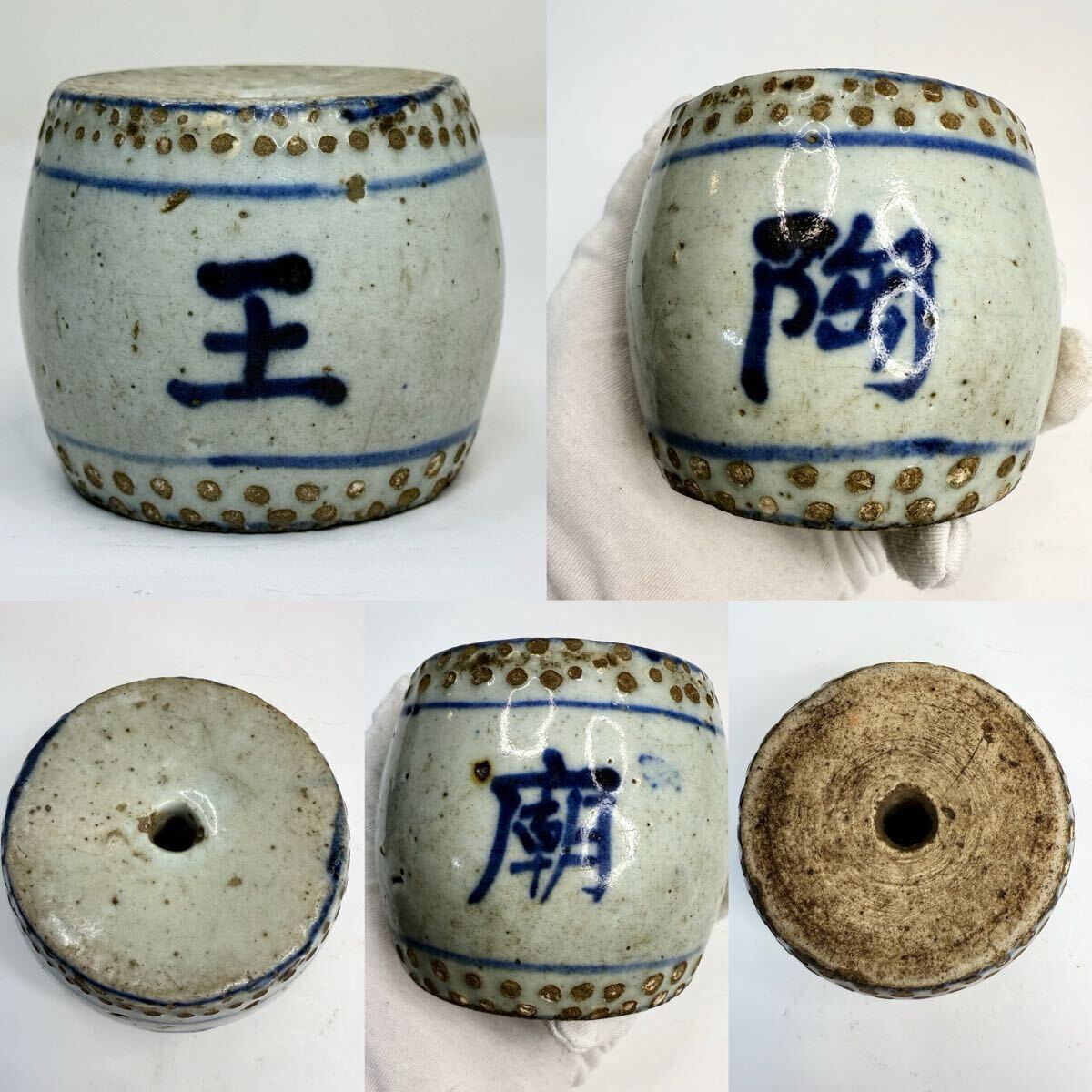 - XMF-中国古美術 時代物 染付 文鎮 鼓釘型 文字図 書道具 文房四宝 文房具 唐物 陶磁器 中国古玩 骨董品