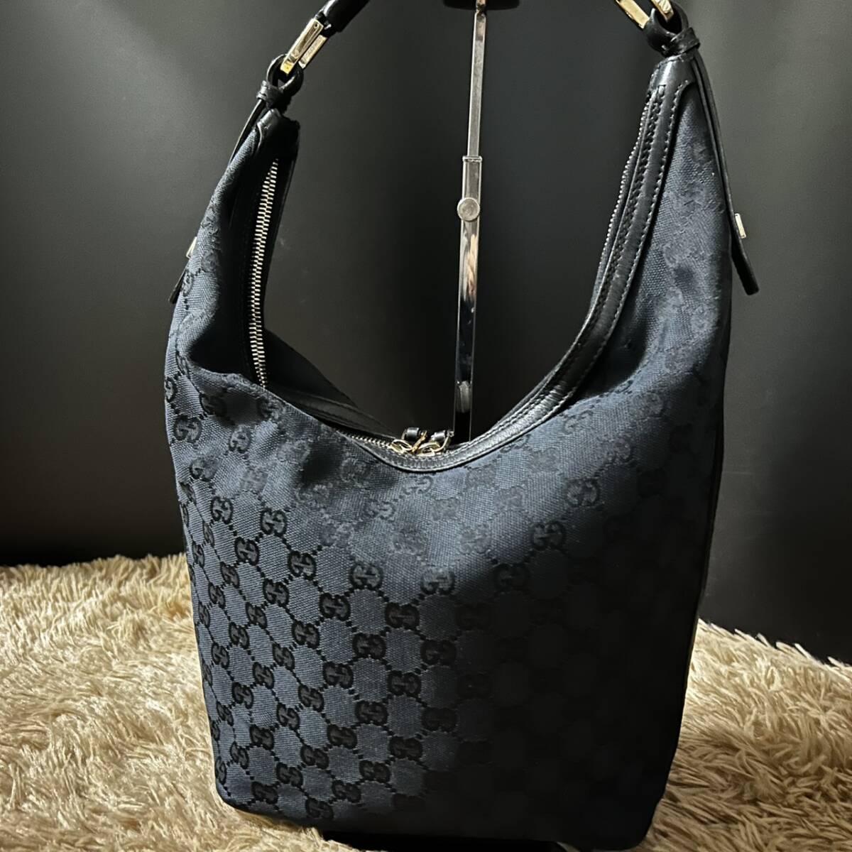 - 1円~【美品】グッチ GUCCI ワンショルダーバッグ ハンドバッグ ホーボー ハーフムーン 手提げ 肩掛け GG キャンバス ブラック シルバー金具