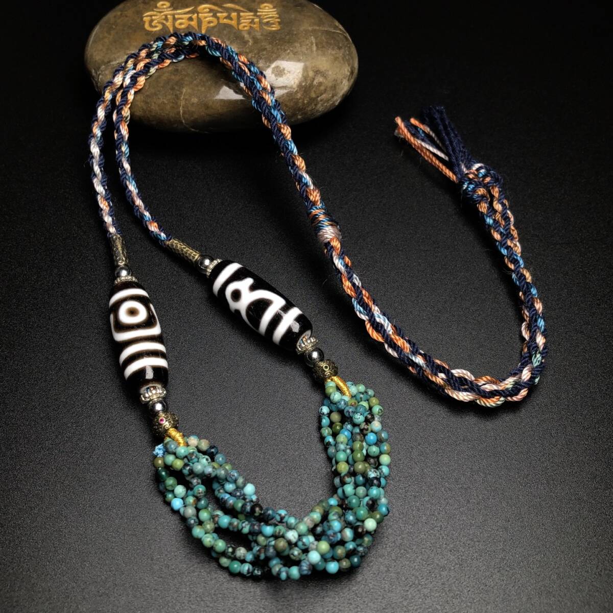 - 旧 蔵区 兩眼天珠 財神天珠 搭配綠松石 項鏈 天然石 高級瑪瑙 時代物 中国古美術 古賞物 古置物 唐物 K711