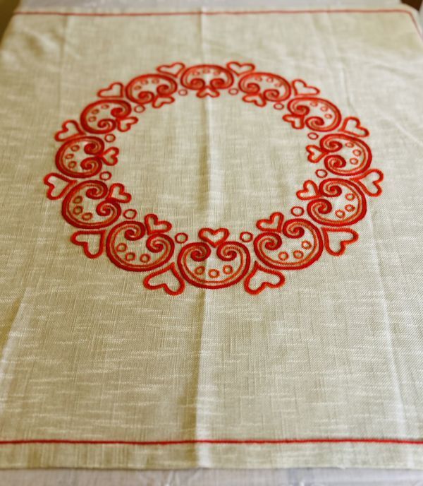 北欧クリスマス☆手刺繍 ジュート地 赤糸刺繍 テーブルクロス