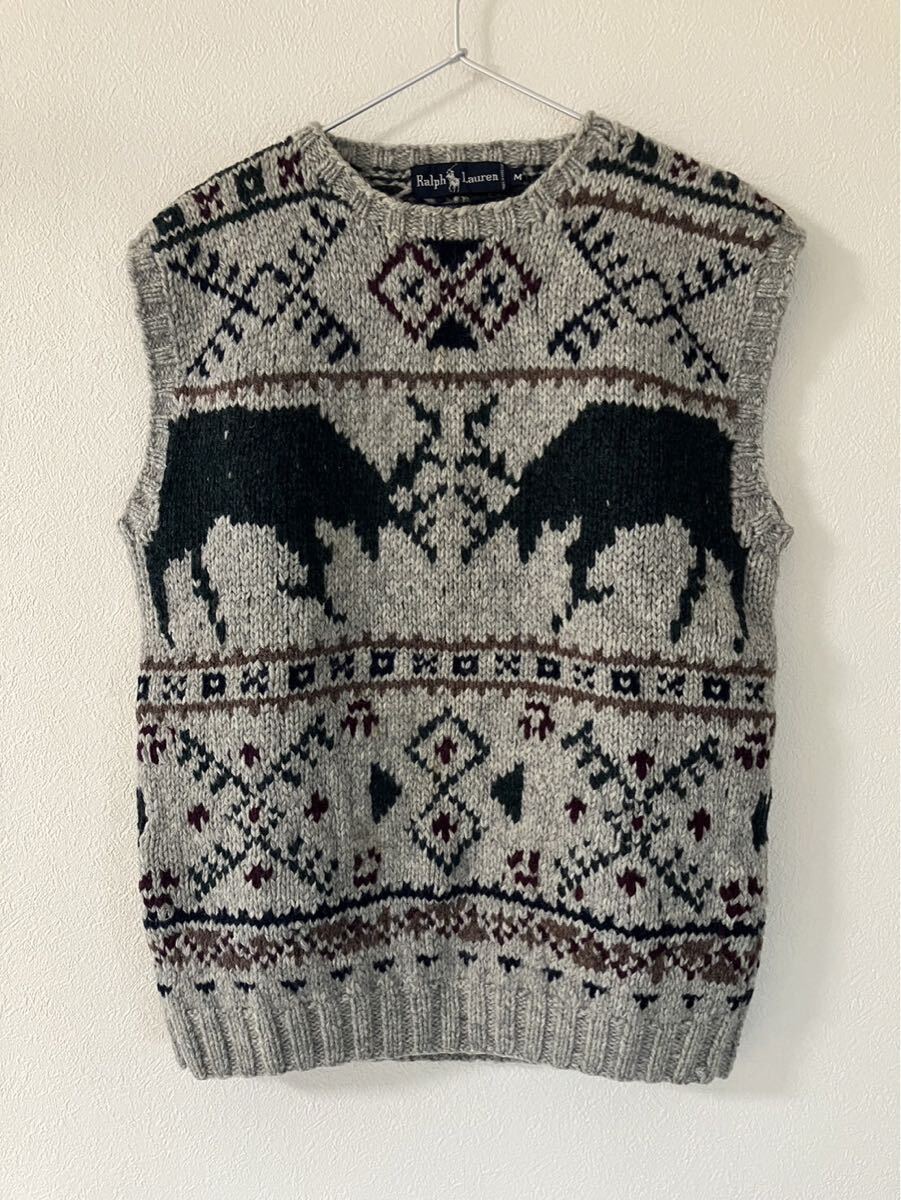 - 90s Ralph Lauren ラルフローレン ハンドニットベスト グレー(トナカイ×スノー) ウール100% Mサイズ 90sオールドラルフ ニットベスト