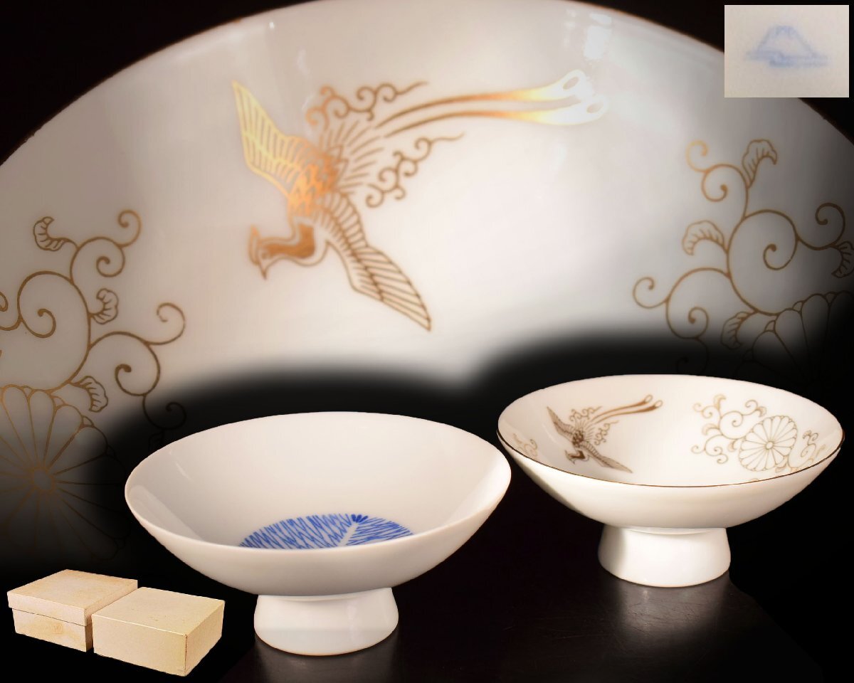 - T611【泉美】宮内庁御用達 染付 正殿松間壁面裂地意匠/金彩 十六菊鶴紋 御下がり品 盃 2点セット 杯 酒器 紙箱入