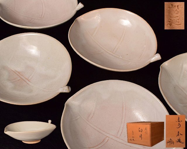R853 【泉美】旭雲山 松延窯 金子松延造 萩焼 葉形 向付 5客 小鉢 懐石道具 共箱入拍卖