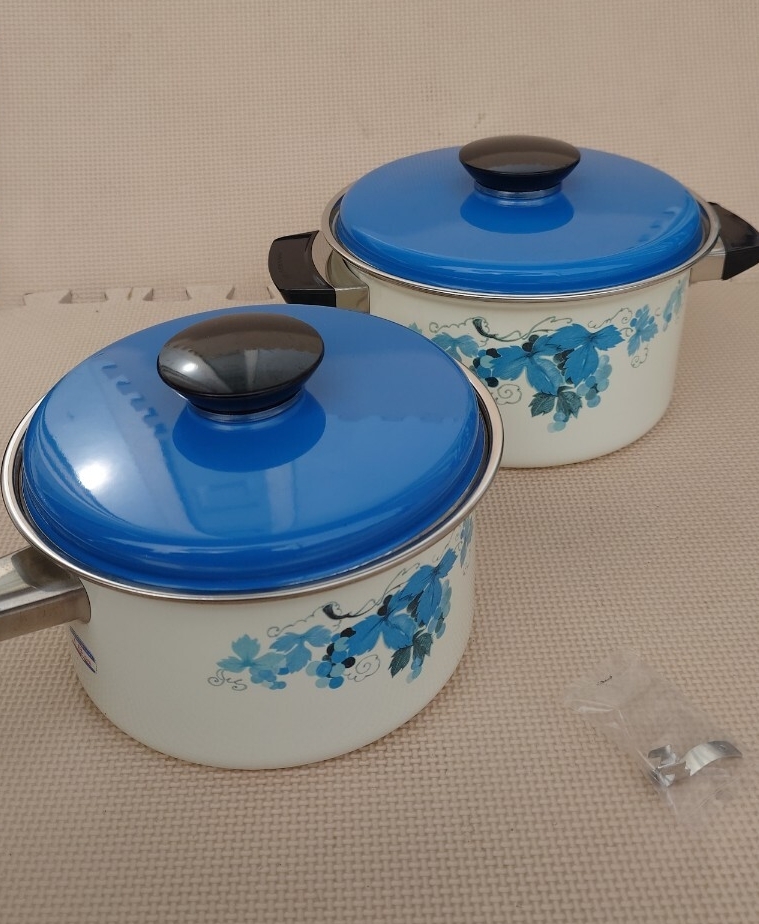 - 未使用 マルビシ ホーローウェア 鍋 2点 セット 20cm 両手鍋/18cm 片手鍋 蓋付 花柄 フラワー 昭和レトロ ビンテージ ホーロー 琺瑯 ブルー