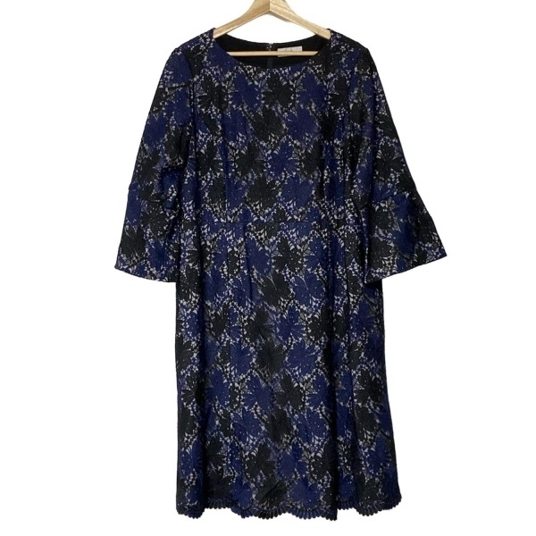 > レリアン Leilian サイズ17+ XL - 黒×ネイビー×ライトグレー レディース クルーネック/七分袖/ロング/レース 美品 ワンピース