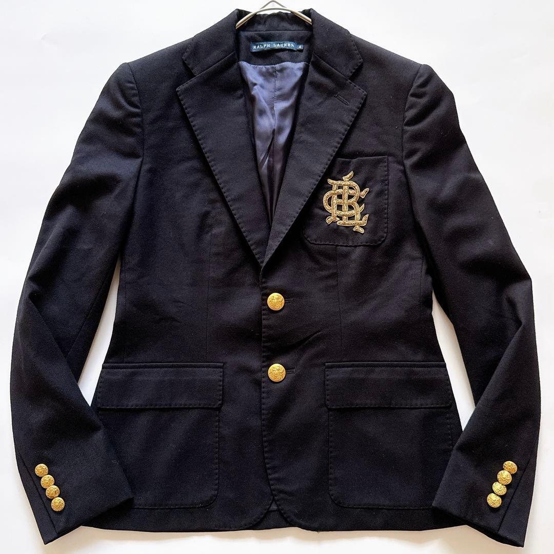 > POLO Ralph Lauren ポロラルフローレン イタリア製 テーラードジャケット 紺ブレ ブレザー 金ボタン エンブレム 重ねロゴ 刺繍 ネイビー 4