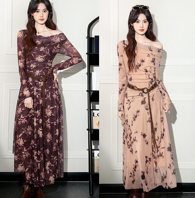 - ワンピース フリル 切り替え バイカラー スリム 着痩せ S ブラウン