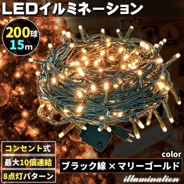 - AC式 イルミネーション コンセント 連結可 LED イルミネーションライト ツリー ライト 200球 200灯 15m 黒線 マリーゴールド