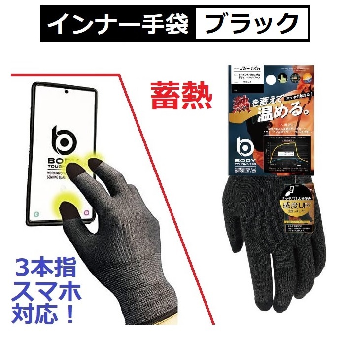 > インナーグローブ タッチパネル対応 Lサイズ ブラック 蓄熱 防寒対策 インナー手袋 3本指 スマホ対応 スポーツ 通勤通学 熱を蓄えて温める