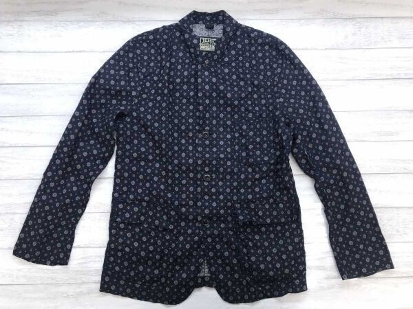 > HINSON ヒンソン アメカジ ユーロ EURO ライク ワーク 古着 総柄 小紋柄 総裏地 テーラード ジャケット メンズ リネン麻100% L 紺
