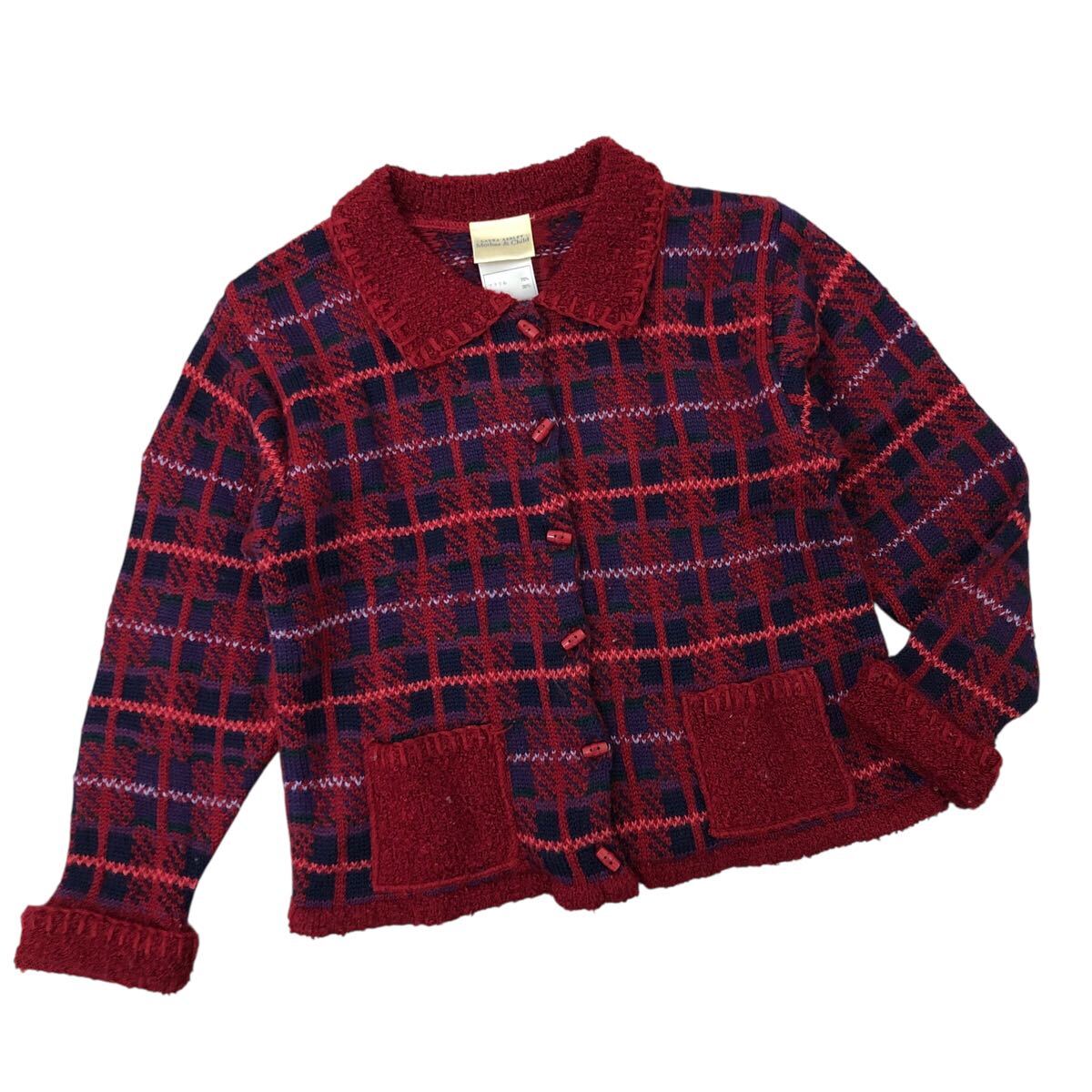 > 11Nm337-59 Laura Ashley Mother & Childローラアシュレイ マザー&チャイルド チェック柄 ニット カーディガン シャツ 羽織り レッド 134cm
