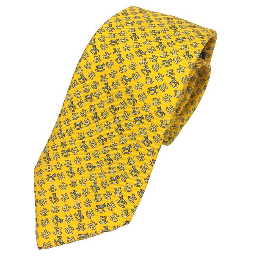 - 送料無料 HERMES エルメス ネクタイ メンズ ROCKING HORSE H柄 木馬 シルク イエロー 未使用 新品 箱付 aq10941