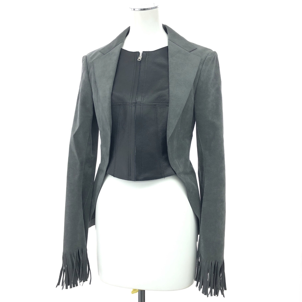> 美品◆JUNYA WATANABE ジュンヤワタナベ コムデギャルソン レザー切替フリンジジャケット サイズ:S JM-J002 ブラック/グレー レディース