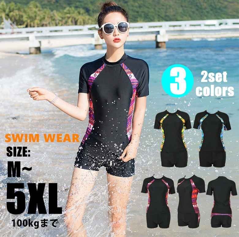 - 大きいサイズ 新作 ラッシュガード 半袖 スイムウェア UVカット フィットネス水着 2点セット M レッド