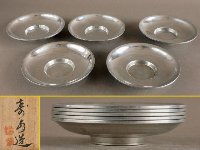 - 二世 壽水 純錫 園式 茶托 五客 煎茶
