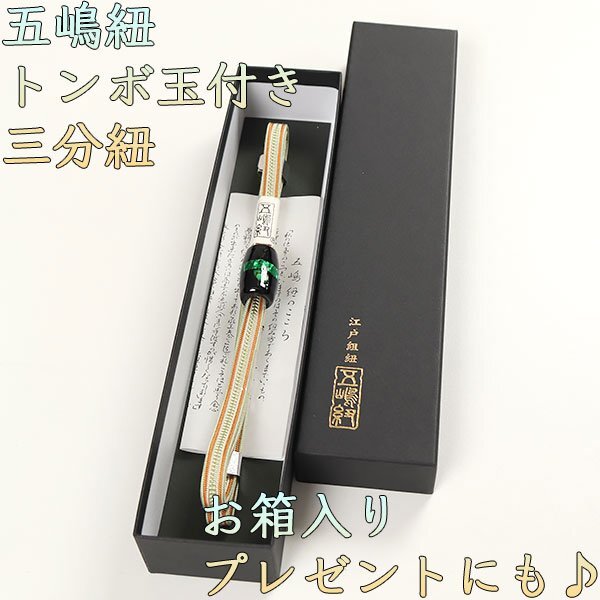 ※こちらの商品にはお仕立てはついておりません。 (Mサイズ/幅:0.9cm) 帯締めの最高峰『五嶋紐』の三分紐トンボ玉つきをご紹介致します。 こちらの三分紐は、苗色、橙色、オフホワイトで縞状に組まれており、 黒っぽい色のトンボ玉の帯留めがついております。 トンボ玉は取り外しが可能でございますので、お手持ちの三分紐に付替えていただくこともできます。 -状態・素材:正絹 -落款・証紙: -参考着用年代:20代~幅広い年代でお召しいただけます。 -着用時期 :夏頃