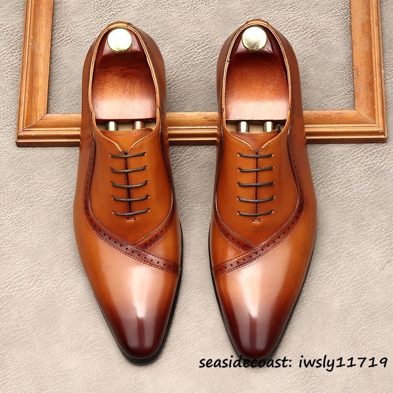 > 最高級◆定価9万 ビジネスシューズ 本革 レザーシューズ メンズ 超希少 職人手作り 牛革 紳士靴 フォーマル 冠婚葬祭 革靴 ブラウン 26.5cm