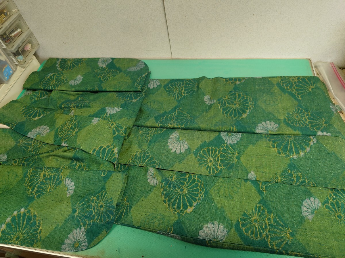 - ●201 モダン 粋な グリーン 菊千代 大柄 菊 紋 素敵 模様 可愛く オシャレ 紬 着物 単衣 美品 ④