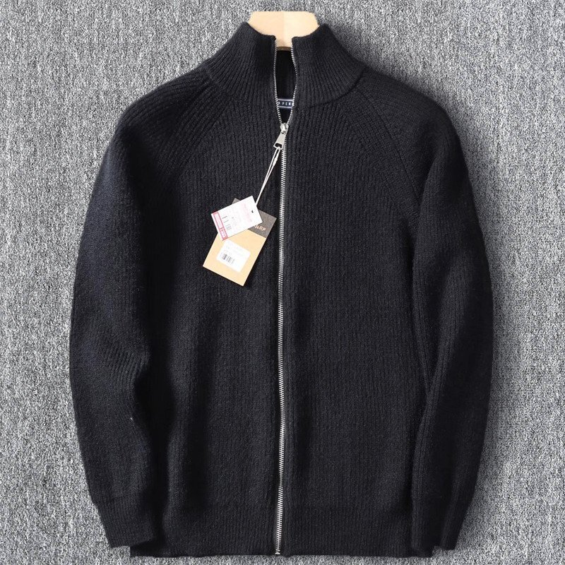 - 高級 新品 ウール混 ジップアップカーディガン メンズ 暖かい リブニット 秋冬 ジップアップ セーター ジャケット アウター 黒 T6016-L