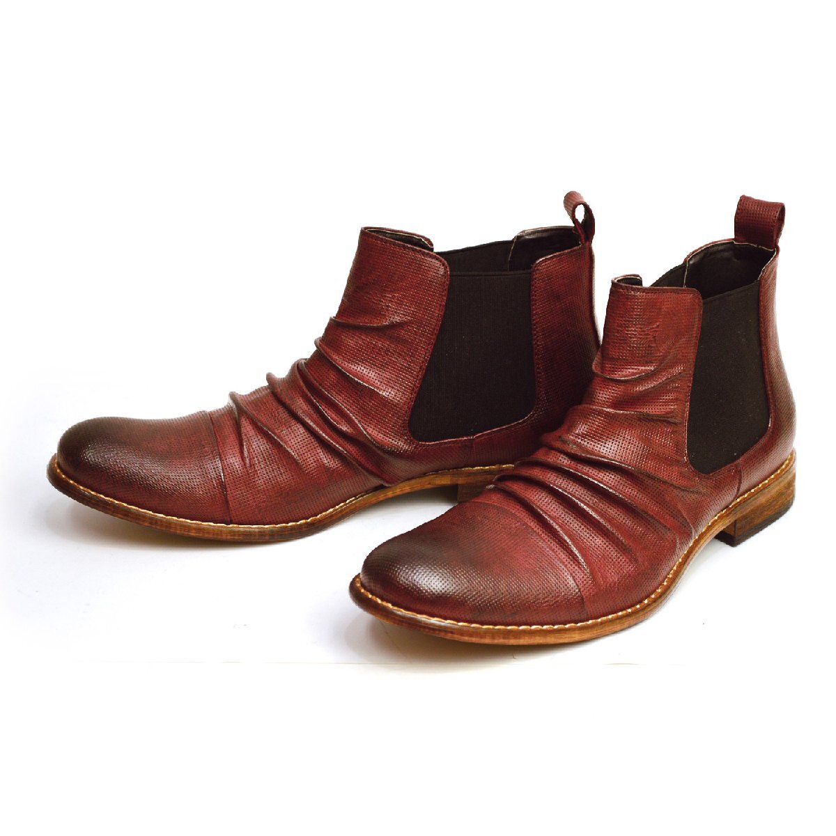 > 新品■25cm メンズ キレイめ 大人ブーツ ドレープ サイドゴア パンチング 革 ストレートチップ ショートブーツ Zeeno 男 靴【エコ配送】