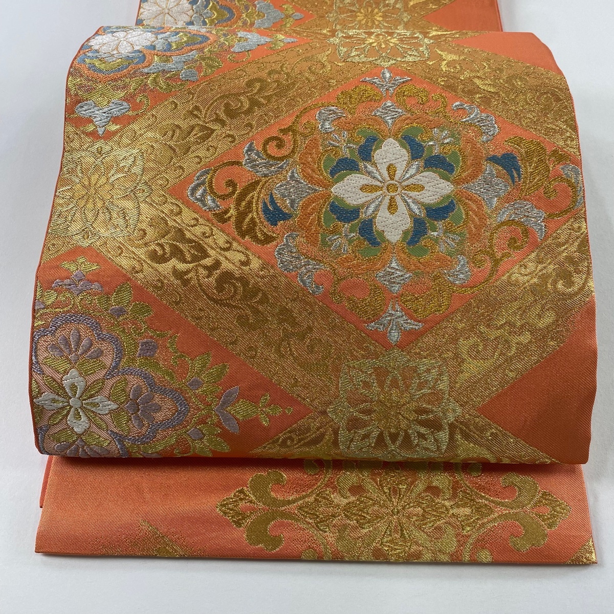 - 【美品】 袋帯 秀品 川島織物 落款 華文 花菱 金銀糸 刺繍 オレンジ 六通 正絹 【中古】