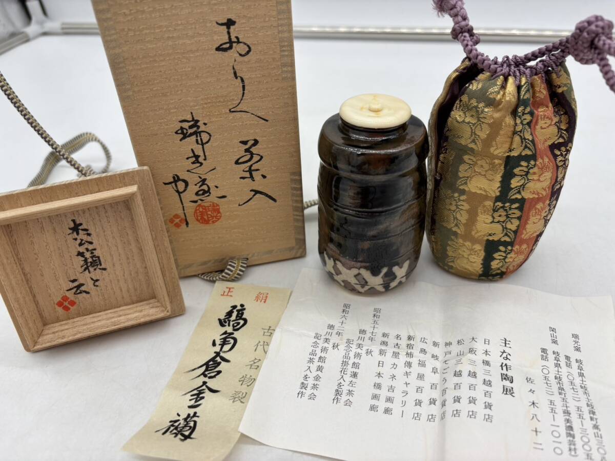 > 【希少】佐々木八十二 おりべ 茶入 織部 瑞光窯 縞角倉金襴 茶道具 茶器 陶器 陶芸 骨董 共箱