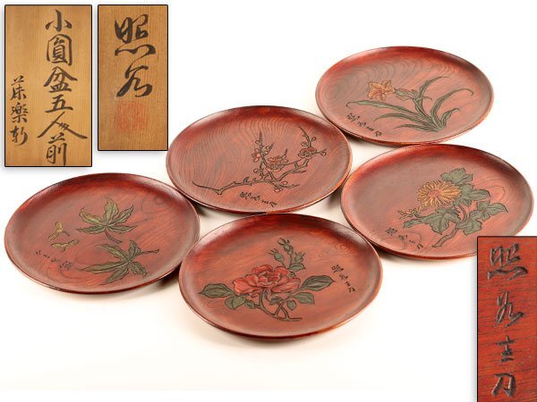 【流】讃岐漆芸 讃岐彫 在銘 彩色絵替盆五客 共箱 HD138