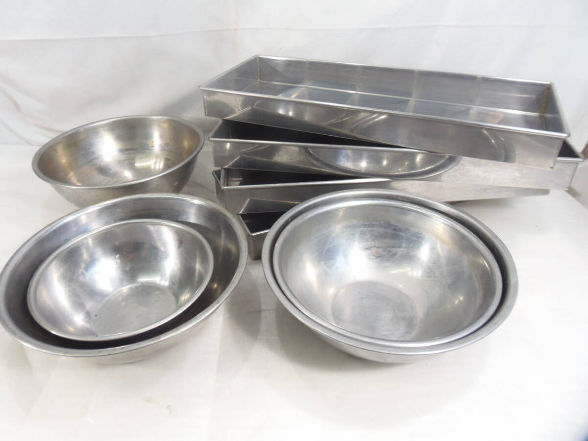 - ● 25K023 ● ステンレス容器 ● ボール 【5個】 19cm1個 /21cm1個 /26cm3個 :バット 【4枚】 業務用(465X190X45mm) ● 現状品 ●