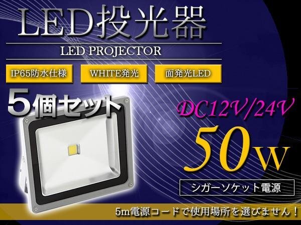 > 『※シガー電源 DC12V/24V』 超便利! 防水IP65 アルミ製 LED 投光器 50W 5個セット ホワイト 白発光 集魚灯 デッキライト 船