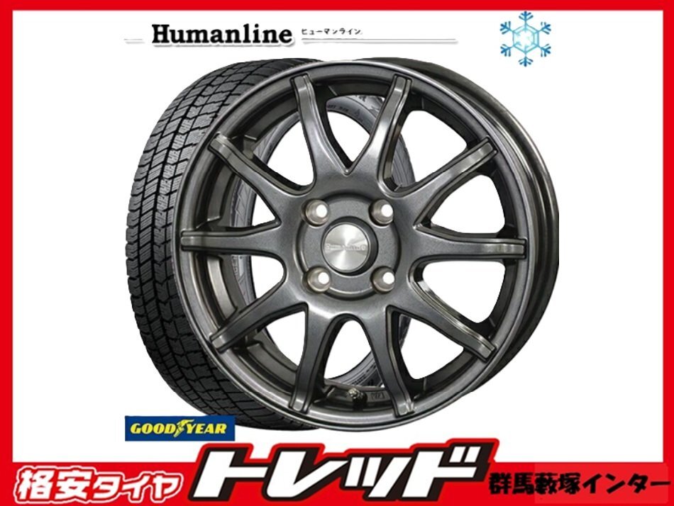 - 藪塚店 新品 冬タイヤセット ヒューマンライン S-15 14インチ 4.5j PCD100 4H +45 グッドイヤー アイスナビ8 155/65R14 2023-24年製