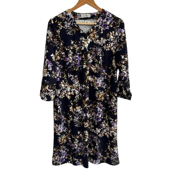 > レリアン Leilian サイズ13+ S - ネイビー×パープル×マルチ レディース Vネック/長袖/ひざ丈/花柄 美品 ワンピース