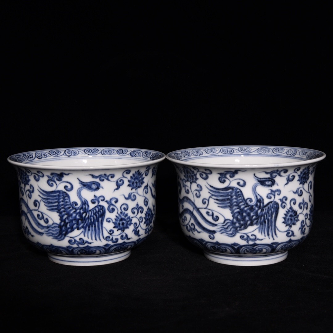 > 永し 明時代 大明宣德年製 青花鳳紋碗 一対 古陶磁器 陶芸 皿 中国陶瓷器 唐瓷 置物擺件 古美術品 古賞物 収集 旧家蔵出 中国唐物