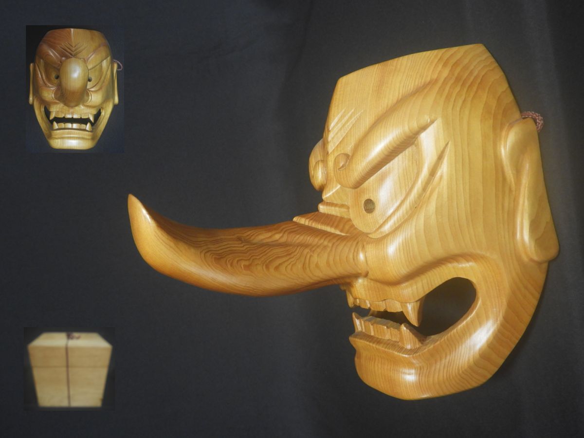 - (c-3) お面 天狗面 木彫り 壁飾り 魔除け 木箱 【送料無料】