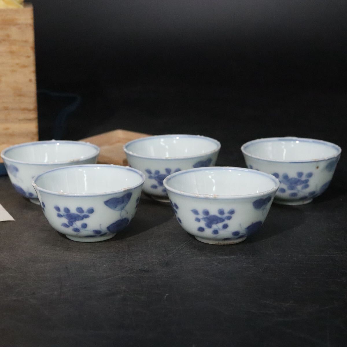> 時代 「 清朝初期 なずな手 煎茶碗 」 染付 5客 共箱 / 中国美術 清 清代 青花 茶器 煎茶道具 .B1392