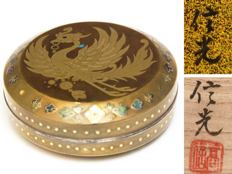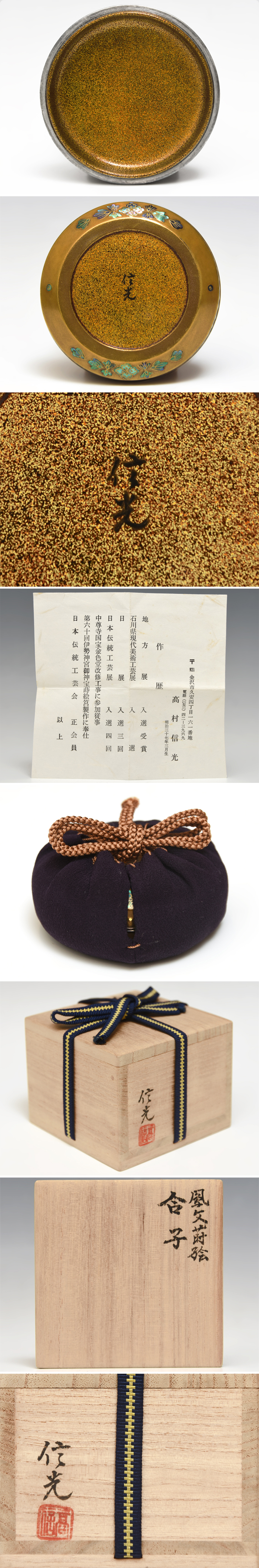 - 加賀蒔絵師 高村信光 (造) 鳳文蒔絵 合子 共箱 御物袋 しおり 茶道具 香道具 螺鈿 青貝 木工芸 蓋物 u1537a