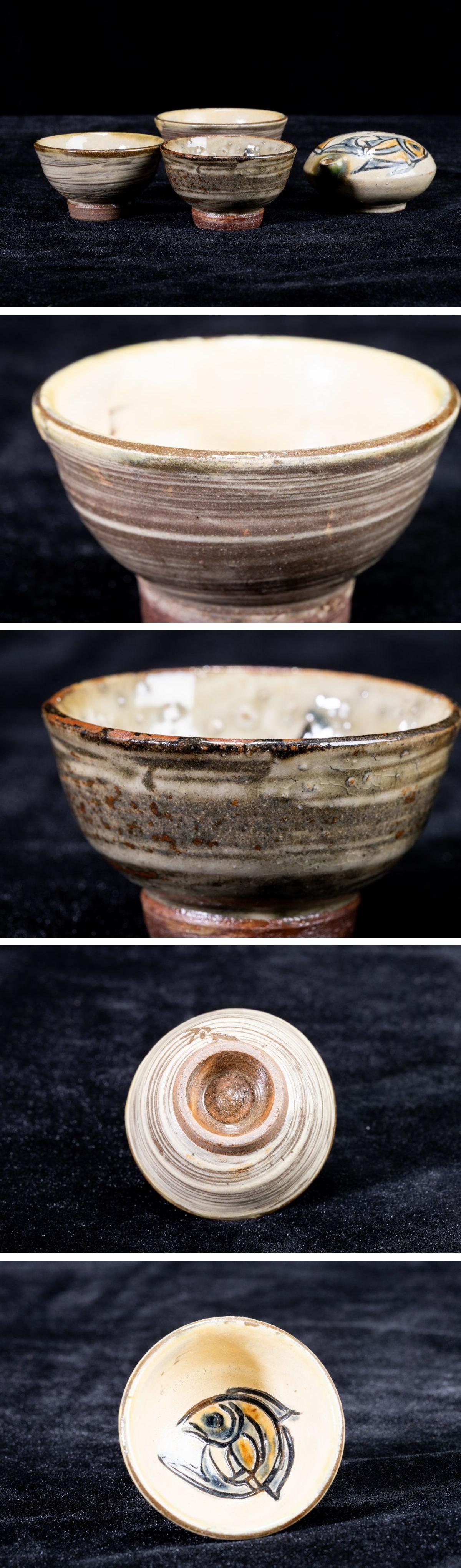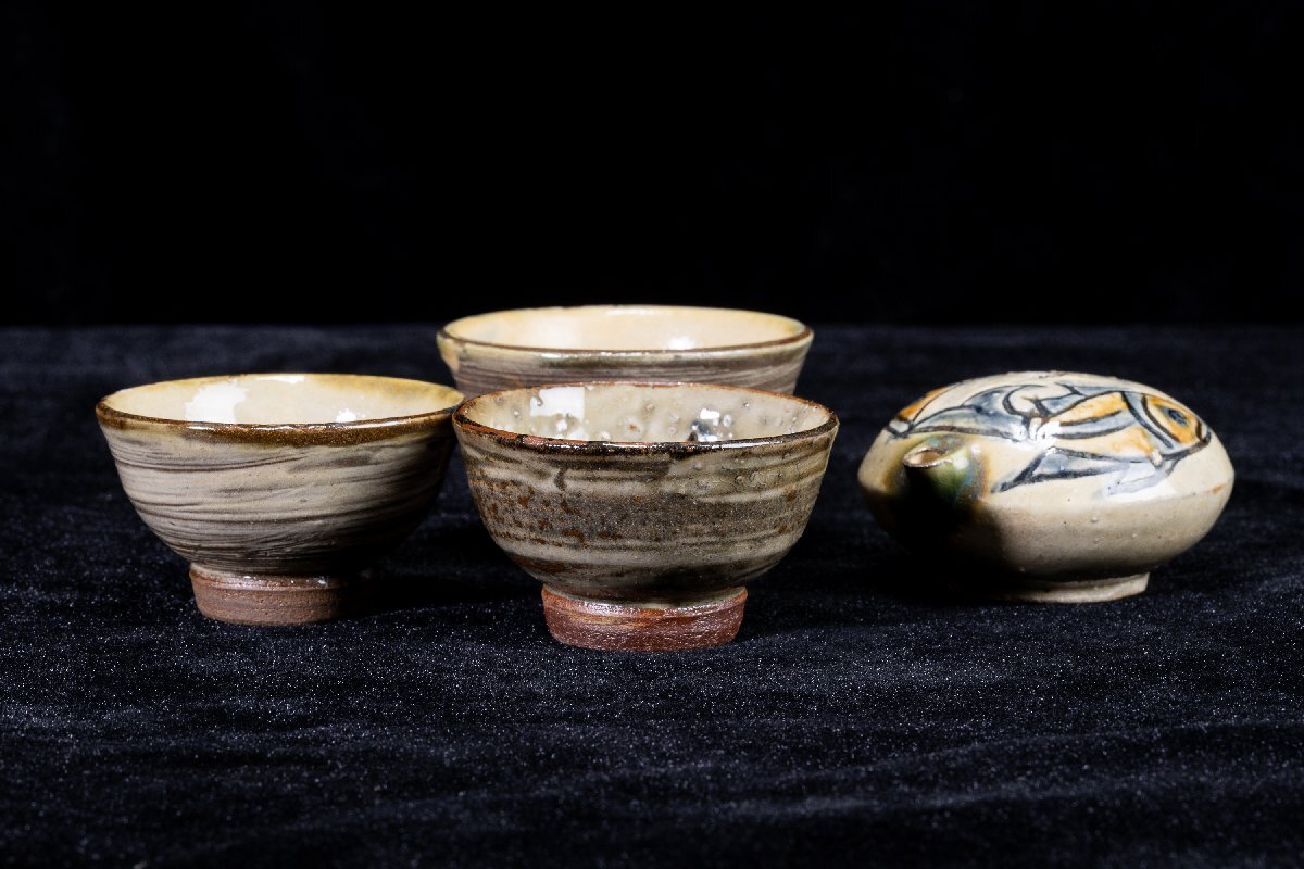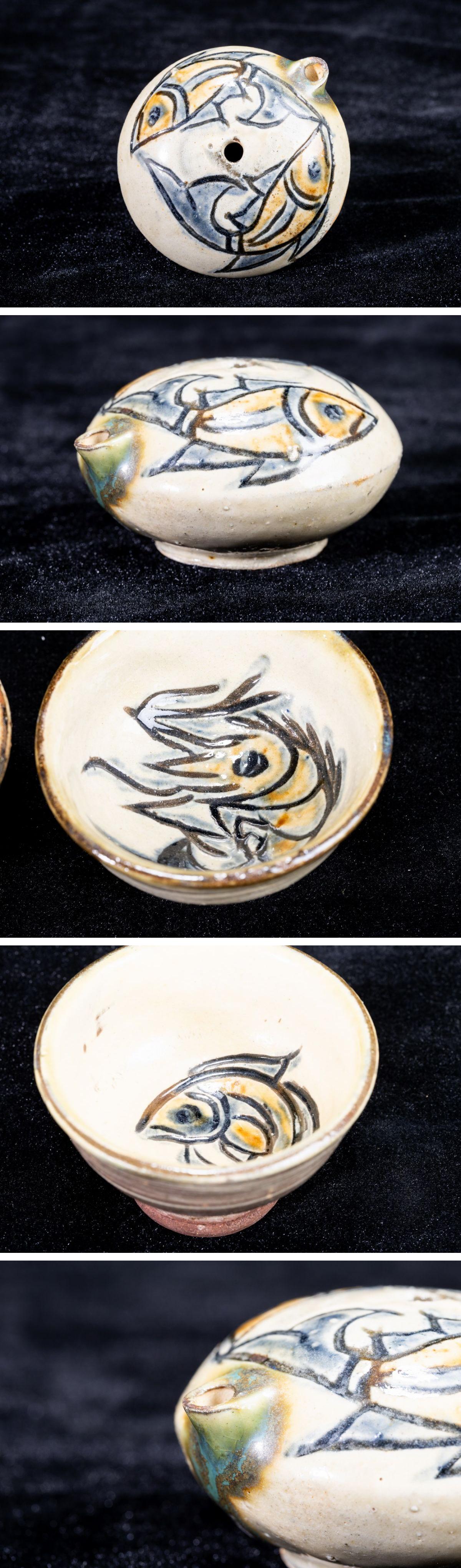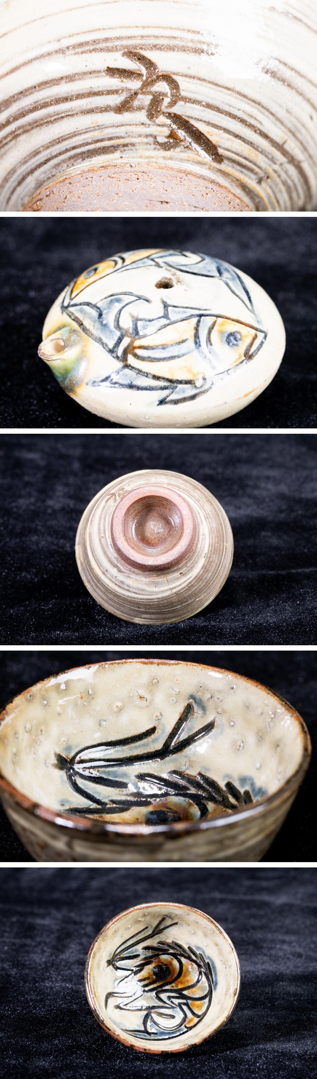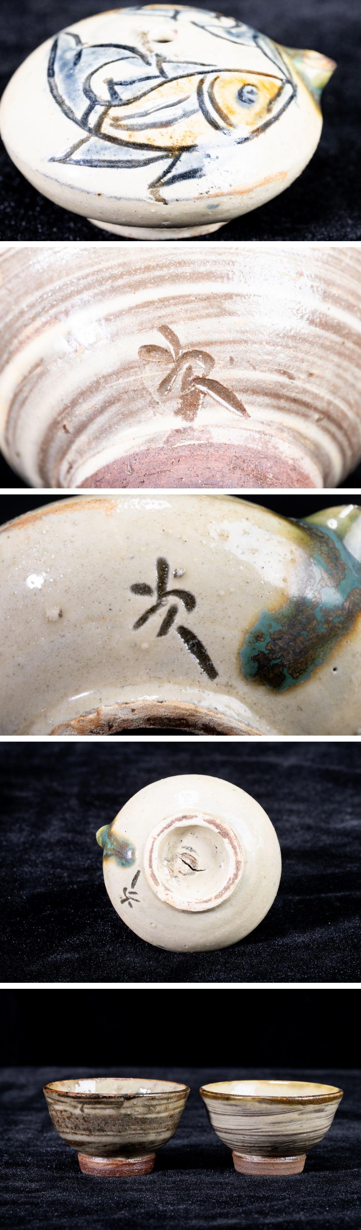 - 【珍品堂】1円から R56-V30 人間国宝 金城次郎 作 壺屋 名工 在銘 魚文徳利 急須 湯呑み 茶道具 茶碗 茶器 煎茶道具 時代物 工芸品 古美術