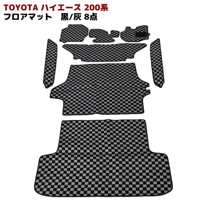 - 200系 ハイエース 標準 1型 2型 3型 S-GL フロアマット チェック 柄 黒 / 灰 8点セット 新品 フロント リア 荷室 ステップ 1台分 トヨタ