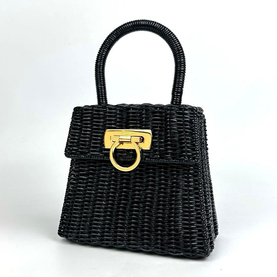 > 美品●Salvatore Ferragamo フェラガモ ハンドバッグ ガンチーニ かごバッグ ラタン カゴ ゴールド金具 レザー 黒色 ブラック フォーマル