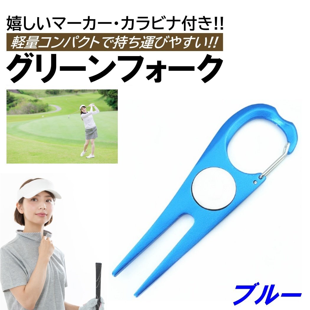 > 青 グリーンフォーク ゴルフ マーカー カラビナ シンプル ラウンド リペアツール ピッチマーク コンペ 軽量 ディボット ツール
