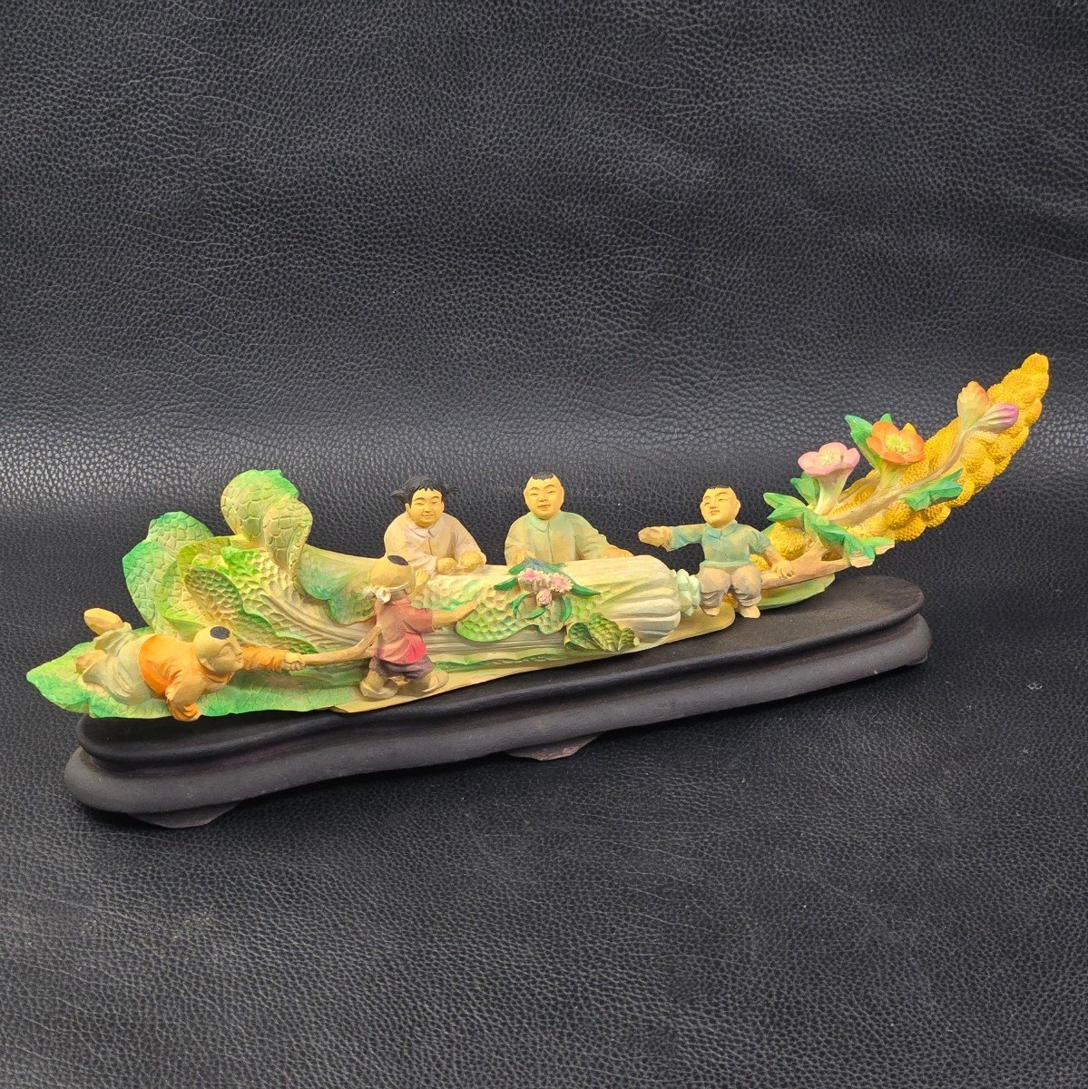 > 中国 木彫 白菜 家族 詳細不明 長さ約50cm 縁起物 唐子 中国古美術 中国古玩 骨董 工芸品 アンティーク 置物 希少品