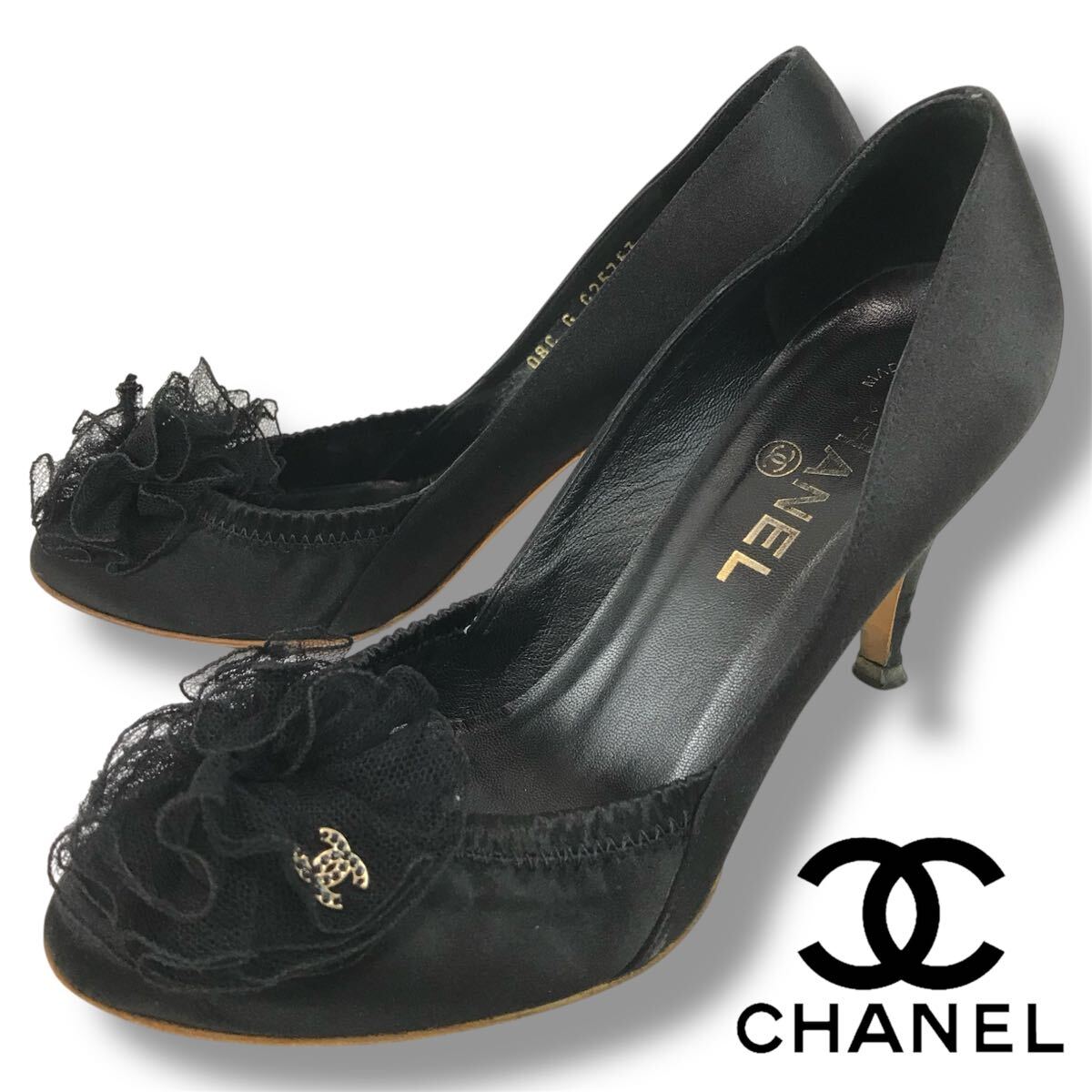 - e39 正規品 CHANEL シャネル カメリア パンプス チュール コサージュ サテン レザー ハイヒール フォーマル シューズ 36.5 G25753 ブラック