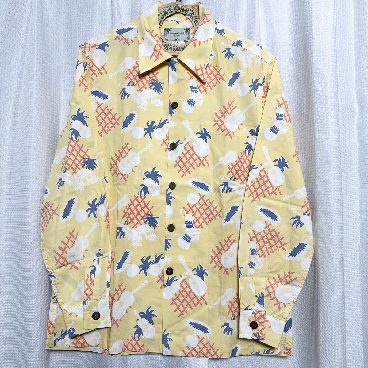 > □/KAMEHAMEHA/カメハメハ/Sサイズ/ハンガー付き/アロハシャツ/シャツ/イエロー/黄/ウクレレ柄/長袖/ロングスリーブ
