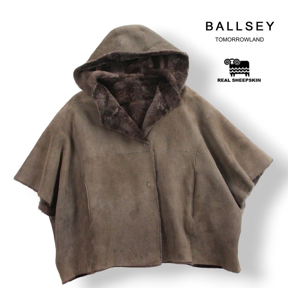 - 美品 BALLSEY ボールジー トゥモローランド 羊革 ダブルフェイス リアルムートン フード ポンチョ コート 茶 38【参考価格¥157,500-】