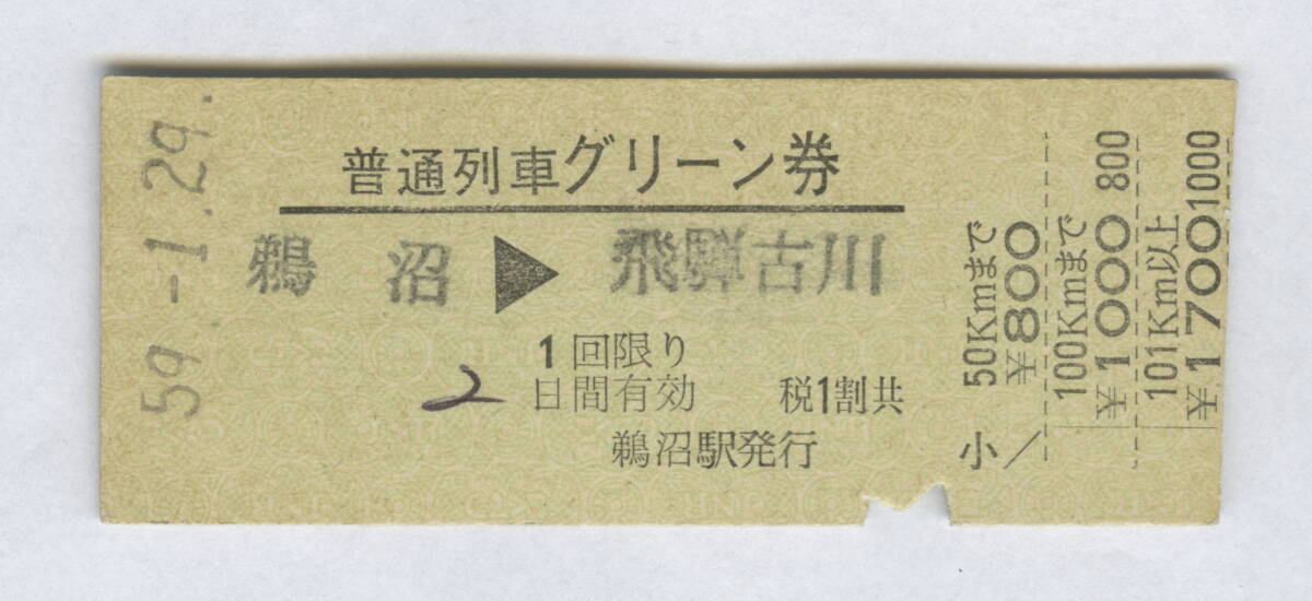 - 国鉄 準常備 普通列車グリーン券 鵜沼→飛騨古川 昭和59年