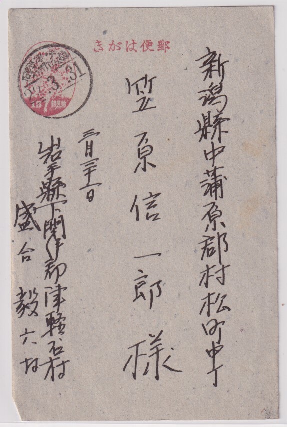 - 桜15銭葉書 ク/岩手.津軽石/22.3.31 15銭料金最終日