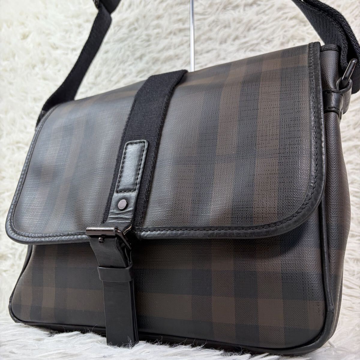 > 1円【美品】バーバリー BURBERRY メッセンジャーバッグ 斜め掛け ビジネス ショルダー チェック PVC×本革 ノバチェック レザー ロゴ刻印