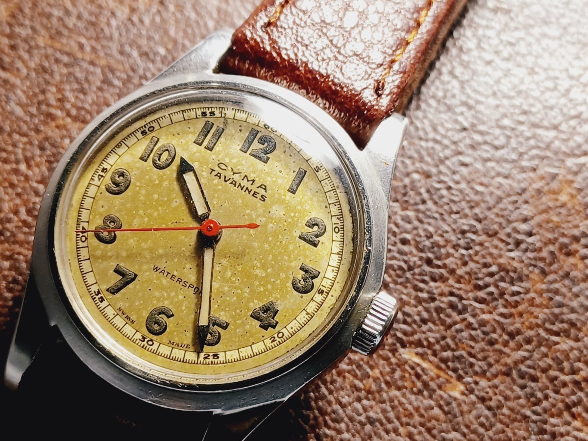 - 1940年代 CYMA 珍しいオールSS製コインエッジスクリューバック防水ケース!オリジナルWネーム文字盤!ダストカバー付き出車式ムーブ搭載!