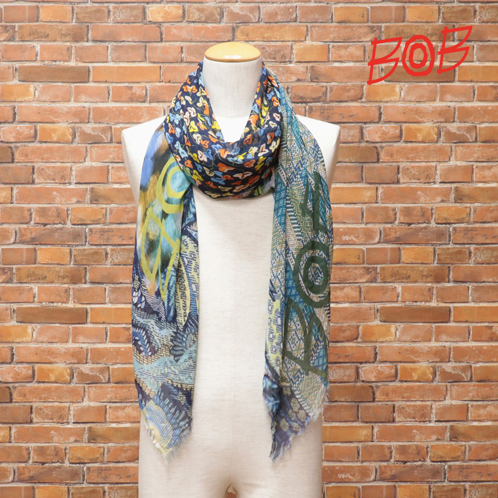 - 1円/BOB/大判ストール 074731805 しっとりレーヨン 幾何学プリント 総柄 モダン イタリア製 ボブ 新品/紺×ブルーグリーン/me137/